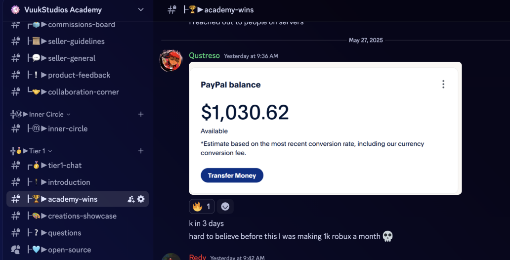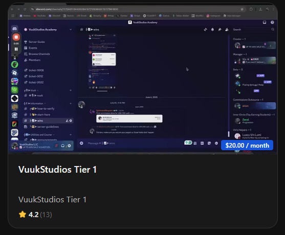 In this Tier 1 Private Community Group you get access to a private Discord for developers, daily tutorials and lessons about scripting, a full LUA course on programming and development, a full course about commissions and how to get them, a guide on how to make money with Roblox commissions, live calls once per week, a questions chat for help, a wins channel to network with others, and 1-on-1 access with me and my developer team.