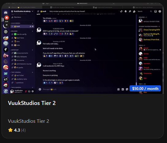 In this Tier 2 Private Community Group you get access to a private Discord for developers, access to all paid store packs and items, live calls two to three times per week, 1-on-1 coaching chats, an exclusive networking chat with our team, connections to high-quality devs, outsourced work and contracts with us, daily tutorials and lessons about scripting, a full LUA course on programming and development, a full course about commissions and how to get them, a guide on how to make money with Roblox commissions, a questions chat for help, a wins channel to network with others, and 1-on-1 access with me and my developer team.